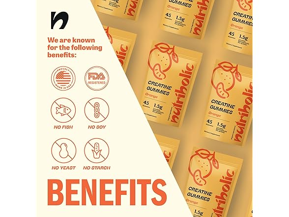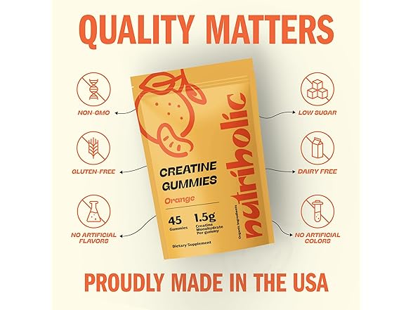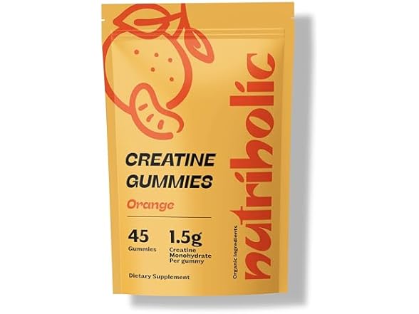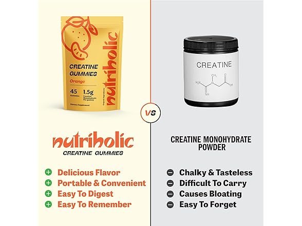 Nutriholic Creatine Monohydrate Gummies for Men and Women - Easy to Digest, Vegan, Gluten-Free, Non-GMO, 1.5g of Creatine per Gummy - 45ct (45 Count, Orange)