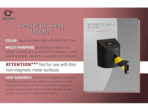 - CROWD CONTROL WITH A SMALL FOOTPRINT: CCW magnetic Wall Mount retractable Barrier promotes safety and organization while eliminating the need for traditional stanchions in places barrier tapehere space is limited. Simply connect the universal belt end to another stanchion or a compatible wall receiver.