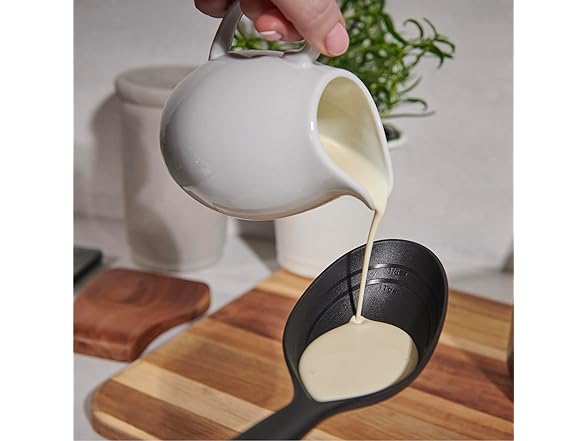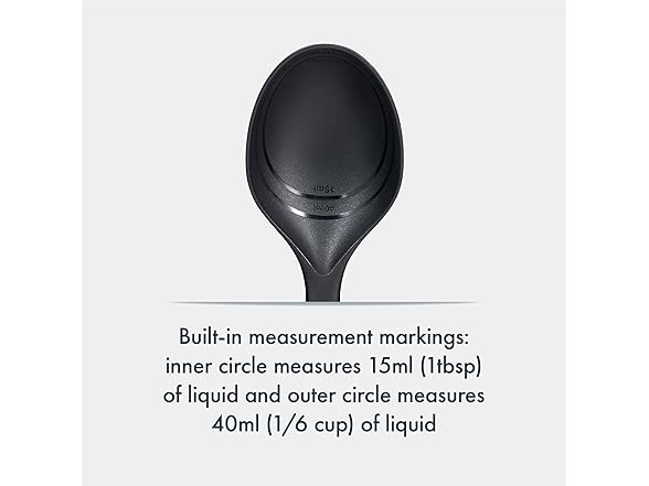 - Measuring Spoon: Built-in measurement markings: inner circle measures 15ml (1tbsp) of liquid and outer circle measures 40ml (1/6 cup) of liquid