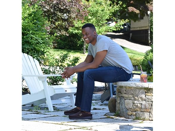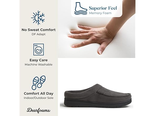 - NO SWEAT COMFORT: These men’s clog slippers feature a perforated microsuede upper with decorative stitch accent, plus breathable, temperature-regulating DF Adapt no-sweat technology for the ultimate in plush foot comfort.