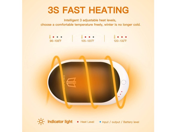 - Fast Heating & Intelligent Temperature - Want to enjoy outdoor sports but are afraid of the cold? DEGBIT double side fast heat hand warmers is the best choice. It has 3 seconds fast heating and 3 levels temperature control [96-108℉], [105-120℉], [118-132℉]. Choose a comfortable temperature freely, winter is no longer cold. Slim yet hot, perfect for raynaud heat therapy and relieve fatigue, winter has never been so warm before.