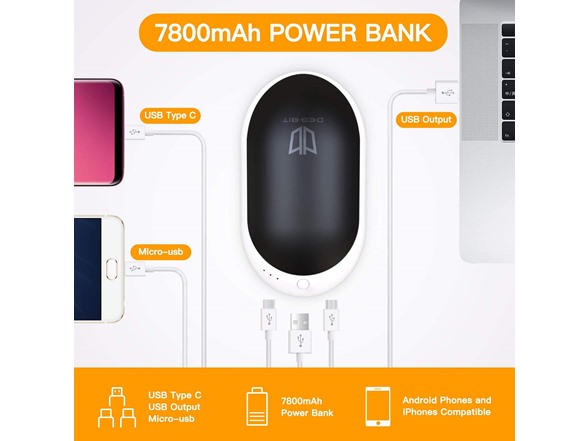 - 7800mAh Large Capacity - 7800mAh super large capacity quick heat hand warmer & Power bank 2-in-1. It's not only an electric hand warmer but also an backup cellphone power bank. With USB Type C/USB Output/Micro-usb charging port, which can easily charge cell phones or tablets, compatible with both android phones and iPhones. It can roughly charge your iPhone X about 2.8 times, Samsung Note 10 plus about 2.2 times. Bring you warmth and energy!