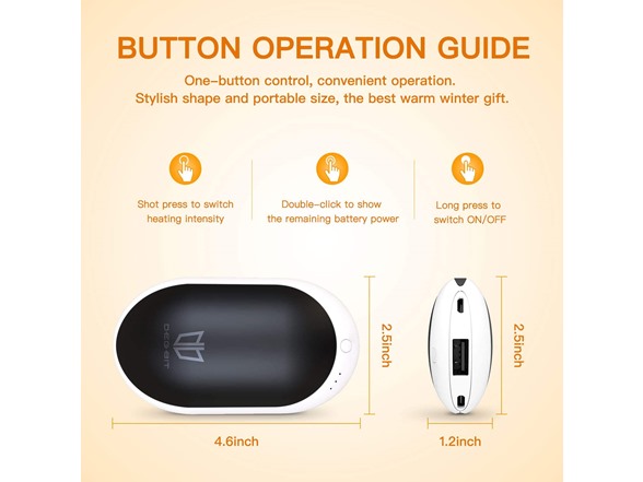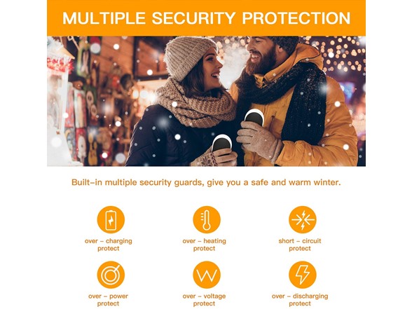 - Safety & Comfortable - Built-in multiple security guards, give you a safe and warm winter. A built-in intelligent protection chip prevents rechargeable hand warmers from over-charging, over-voltage, over-current and short-circuit. What's more, the rechargeable lithium battery is certificated with UL, FCC, RoHS and CE, it meets international safety standards. Made with high-tech aluminum and ABS, it's more durable, anti-skid and shockproof.