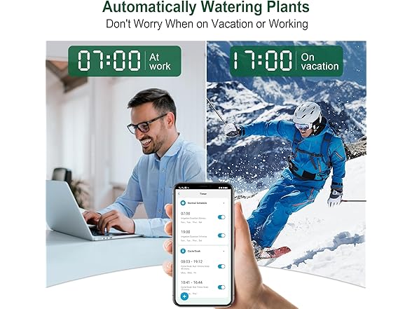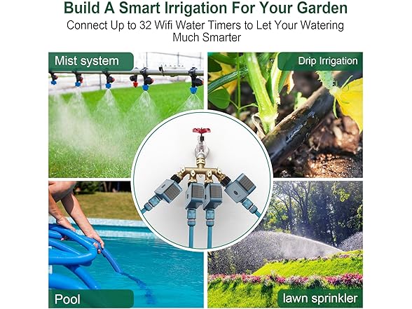 - 【Extended Irrigation System】: One WiFi hub can control up to 32 WiFi water timers , building a smart irrigation system for your garden. And one WiFi water hose timer can set up to 20 watering schedules (10 normal schedules and 10 cycle/soak schedules ), meeting your different watering demands. Also, you can add family members to the App and share home irrigation management.