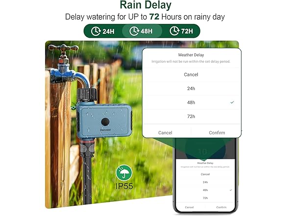 - 【Manual Watering & Weather Delay】: In manual mode, water as desired at any given moment, choosing a customized time ranging from 1 minute up to 24 hours, and don't worry about disrupting preset schedules! With weather delay function, you can pause programmed schedules for 24h, 48h or 72h, then it resumes automatically.