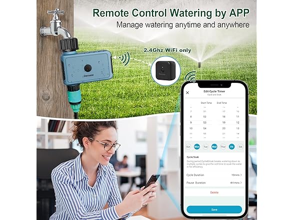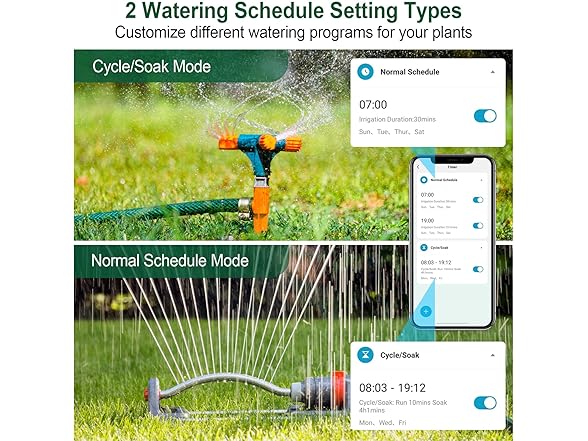 - 【2 Irrigation Modes】: Under normal schedule, the hose timer run on its own and water at a specific time. Customize its start time, irrigation duration, and watering weekly day to meet your different watering needs. Under the cycle/soak watering mode, the faucet timer will cycle watering within the preset start and end times automatically. When watering schedules are set, the irrigation timer will take over the control of the lawn and garden.