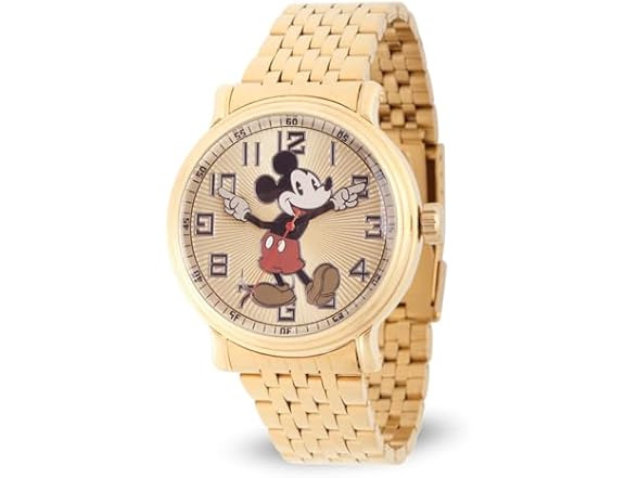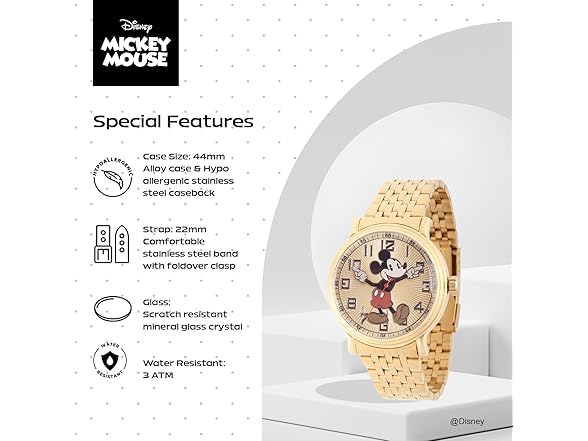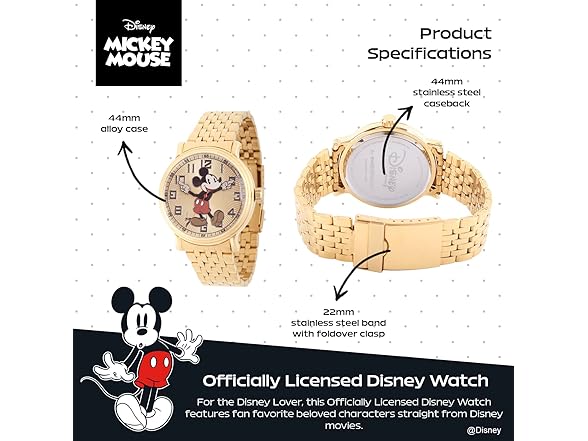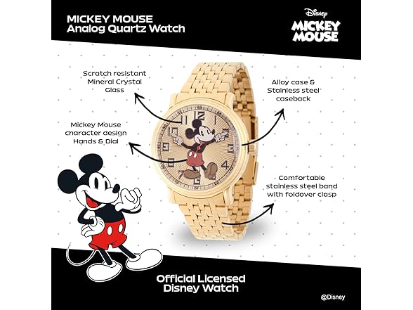 Disney Mickey Mouse Watch The Vintage Mickey Watch from Disney is a charming timepiece for any Disney enthusiast. Featuring an iconic Mickey Mouse Articulating Hands design, this watch combines nostalgia with functionality. With a 44mm metal case and stainless steel strap, this watch offers a comfortable fit. The gold dial gives it a timeless look, while the analog display is powered by precise Quartz movement for reliable timekeeping. Built for everyday wear, the watch is water-resistant up to 100 feet, making it safe from splashes and rain. The scratch-resistant mineral dial window ensures durability, while the buckle clasp provides a secure fit. Weighing only 1.8 ounces, this lightweight watch offers effortless wear throughout the day. Whether you're looking for a classic Disney watch or a unique Mickey Mouse watch, this vintage-inspired piece is perfect for fans of all ages. It’s a great gift for birthdays, anniversaries, or any special occasion. With its timeless design and reliable features, the Vintage Mickey Watch is sure to be a treasured addition to any Disney lover’s collection. Plus, it comes with a 1-year warranty for added peace of mind.