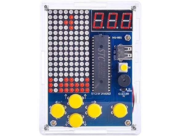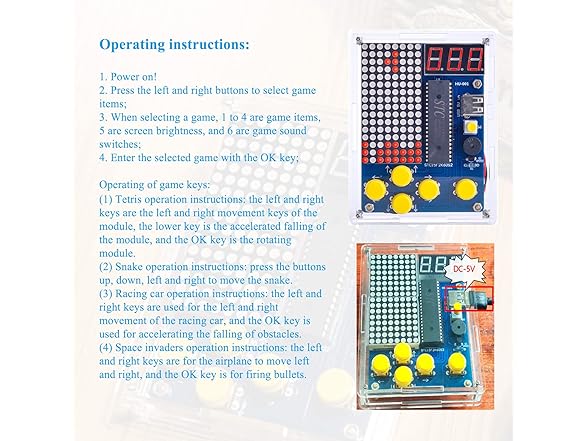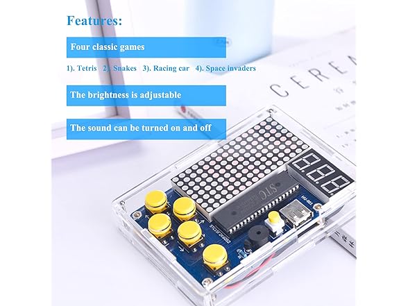 - 【Classic Game Toy Kit】: After assembly, you will get a classic game console. It comes with four classic games: Tetris, Snakes, Racing car and Space invaders. The digital tube on the top shows the score, and it can save the record of the highest score. It can be powered by USB or battery, its sound can be turned on or off, and its brightness can be adjusted. It come with beautiful acrylic shells.
