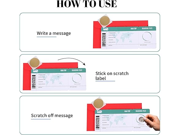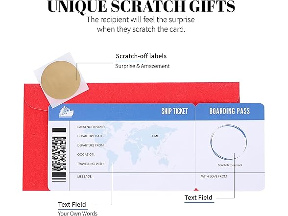 - Fun to Use - What makes this travel gift card even more appealing is how easy this boarding pass is to use. Simply write down the destination, apply the fake scratch sticker, & you’re ready!
