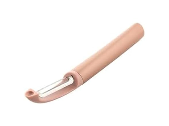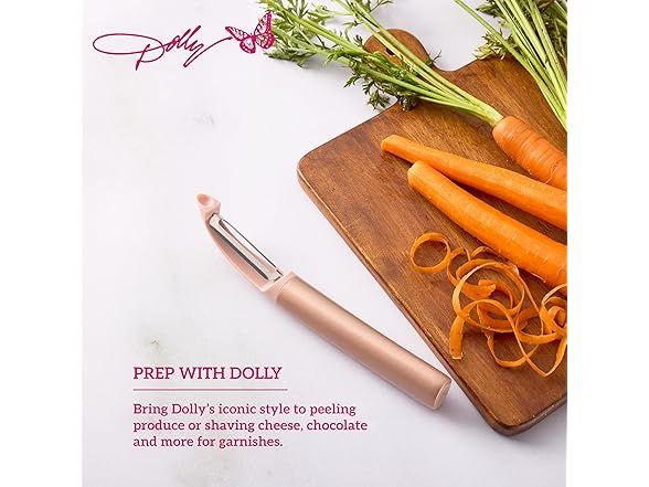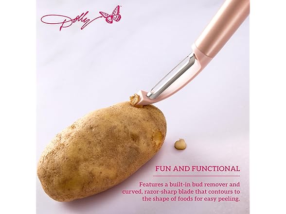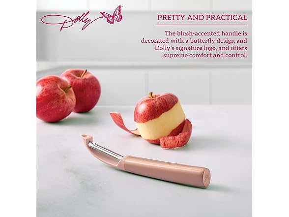 Dolly Parton Euro Peeler with Blush Design – Razor-Sharp Curved Blade for Fruits and Vegetables, Built-In Potato Bud Remover, Ergonomic Handle, Dishwasher Safe, 7.8 Inch