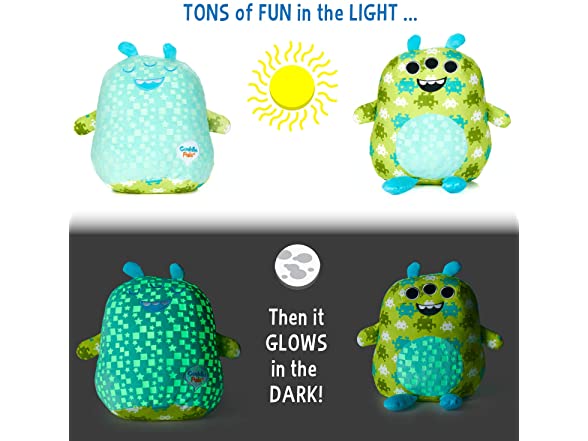 - TWICE THE FUN: Glow in the dark Cuddle Pals are double fun! Sleepy on the back side and awake on the front, they are squishy, super soft, hug pillow plush animals that your child will cherish.