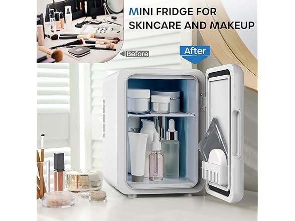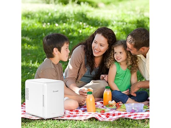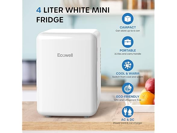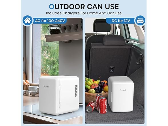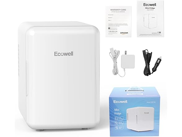 - MULTI-PURPOSE: ECOWELL mini fridge for skin care, includes AC and DC power cords, AC for 110V standard home outlets, and DC for 12V car charger, indoor or outdoor can use. Multiple placements options-store beverage, skin care, beer, cosmetic, makeup, beauty, drink, coca cola, soda, etc., on bedroom, dorm, car, office, desk, room.