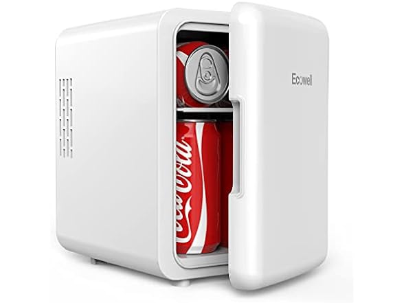 - COMPACT & PORTABLE: ECOWELL WRE100 mini refrigerator, 4-Liter capacity, can store up to 6 can-12 oz soda / Coca-Cola, 3.3 Lbs, external size is 10.4x6.9x9.7 inches, interior size is 5.3x5.1x7.9 inches. It has a removable divider and a shelf, free to arrange space. And convenient carry handle makes it easy to take.