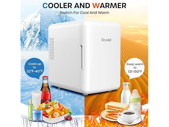 - COOLER & WARMER: ECOWELL small fridge cools up to below ambient temperature 59-68℉(15-20℃) and can reach as lowest as 37.4℉(3℃); keep warm to 131-150°F (55-65°C). Please note that the cooling and warming functions vary with the ambient temperature and cannot be maintained at a constant temperature.