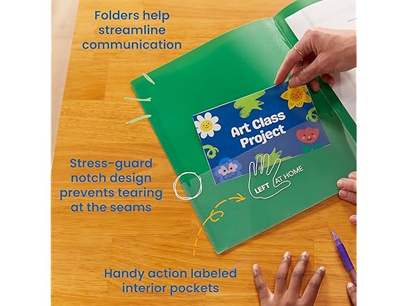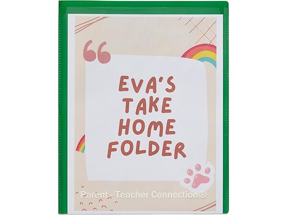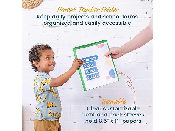 - Classroom Connection: Parents can stay engaged in their child's academic journey with take-home folders; two interior pockets for 8.5" x 11” papers and two exterior sleeves for personalization