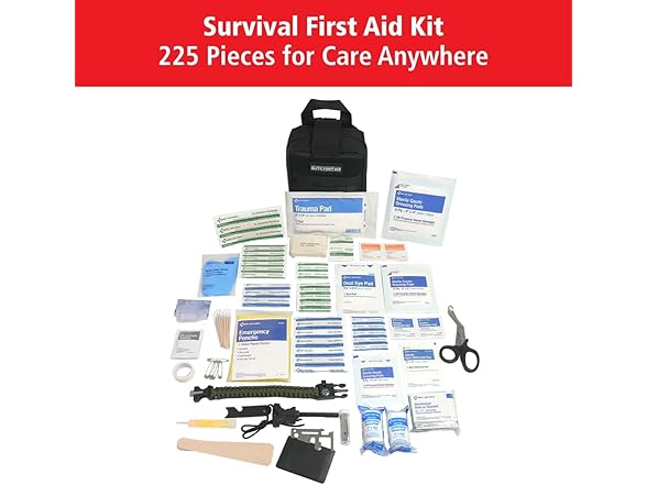 Stay prepared for any situation with this all-in-one First Aid Kit Bag and Camping Survival Kit. Designed for exploring the outdoors, this hiking first aid kit for backpacking, hunting, and more helps ensure emergency preparedness. Packed with 225 essential first aid supplies, this emergency survival kit provides everything you need to address cuts, sprains, and wounds, while also equipping you for other unexpected situations. Inside, you'll find first aid essentials like BZK antiseptic wipes, fabric and plastic bandages, a triangular bandage, sting relief wipes, and a variety of gauze. For more advanced injuries, our MOLLE first aid kit includes an emergency blanket, CPR face shield, and trauma supplies. Beyond first aid, survival tools such as a poncho, multi-function tool card, paracord bracelet, fire starter, and light stick ensure you're prepared for the unexpected. The durable MOLLE-compatible pouch easily attaches to a vehicle headrest, backpack, or belt for quick access in emergencies. With three large compartments, it keeps supplies organized and within reach. Perfect for use as a car emergency kit, outdoor first aid kit, hunting first aid kit, or a disaster preparedness kit at home, this survival kit ensures you're always ready when it matters most.