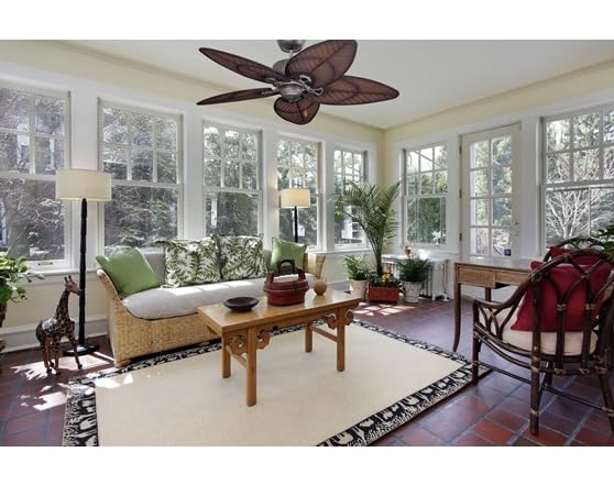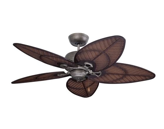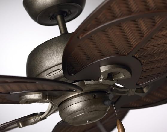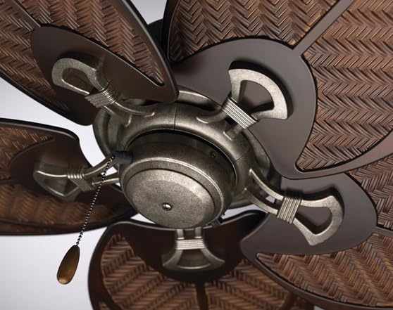 When Air Comfort Gets Tropical, featuring a wet location rating, the Emerson 52-inch Batalie Breeze ceiling fan is perfect for porches, verandas, and patios, no matter the season. With its rustic Vintage Steel housing and 52-inch Weather Resistant Antique Stain Wicker Leaf blades, relaxation is a given with this tropically-inspired fan hanging overhead.- The Batalie Breeze ceiling fan is UL (Underwriters Laboratory) listed for wet locations