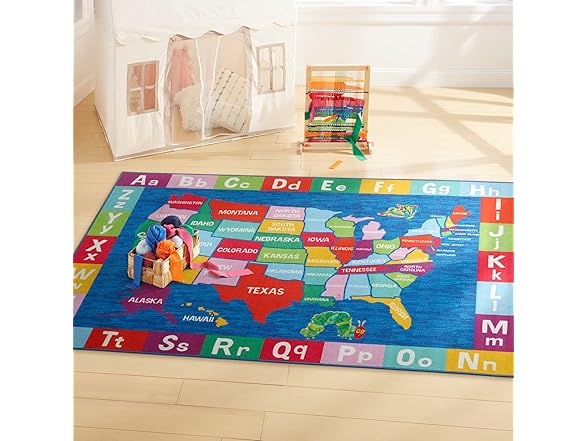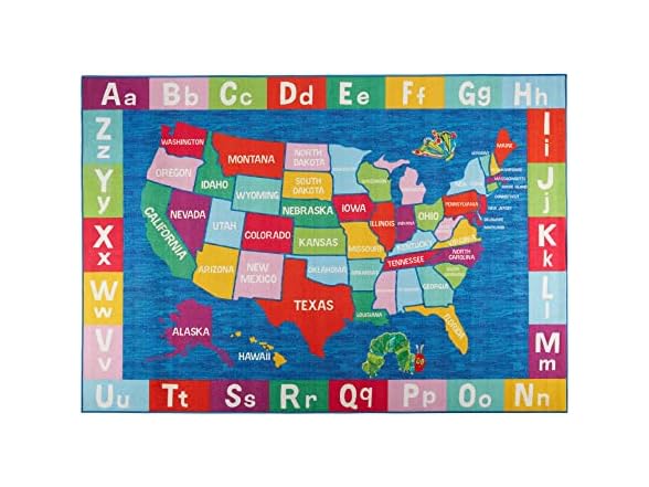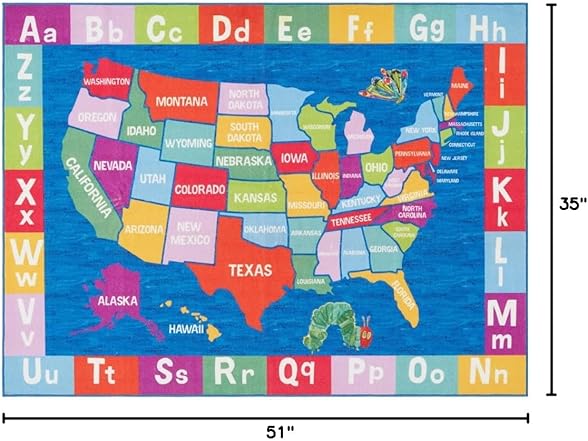 - CHEERFUL AND EDUCATIONAL: Carle’s bright and cheerful artworks are brought to life with this fun indoor rug, while featuring thought provoking motifs for educational purposes. World Maps, USA Maps, Upper & Lowercase Alphabet letter border. Kid friendly designs – Flamingos, Turtles, Caterpillar, Penguins. Letter with Animal association teaching elements.