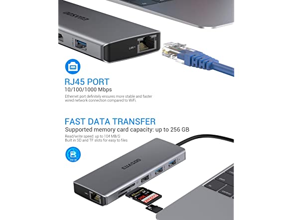 • Make Your Life More Intelligent: Perfectly combined the function of USB c hub and docking station featuring type c port (PD charging supported), 2 x 4K HDMI ports, 2 x super speed USB 3. 0 Ports(Up to 5Gbps), 2 standard USB 2. 0 Ports, Ethernet RJ-45 port, SD card reader, TF card reader and 3. 5mm Audio/mic 2-in-1 jack.