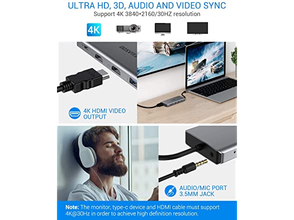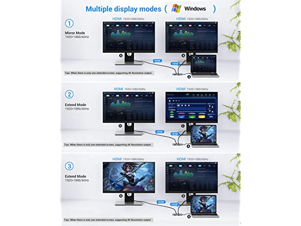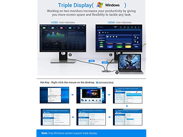 • Triple Display for Windows & 4K UHD Resolution : Only Windows system supports Triple display. MAC OS system does not support Triple display, it only support: the same screen on two external monitors +1 different screen on the laptop. Supports Mirror mode up to 4K@30HZ. When using Triple display mode, the resolution of one of the displays is 4K@30HZ, another will be limited to 1080P@60HZ. Windows system can switch mode by “windows + p” key or clicking the mouse on the desktop “Intel Graphics Settings” .