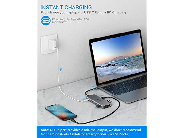 • High-speed charging: Support PD charging at max 87W. This multiport USB C adapter provides one Type-C pass through Female port by which you could securely charge your laptop while connecting multiple peripherals for data transferring and worry-free power storage. With power delivery, a single USB-C port can give you Blazing-fast charging speed experience. (Note: advise use original power adapter of your laptop)