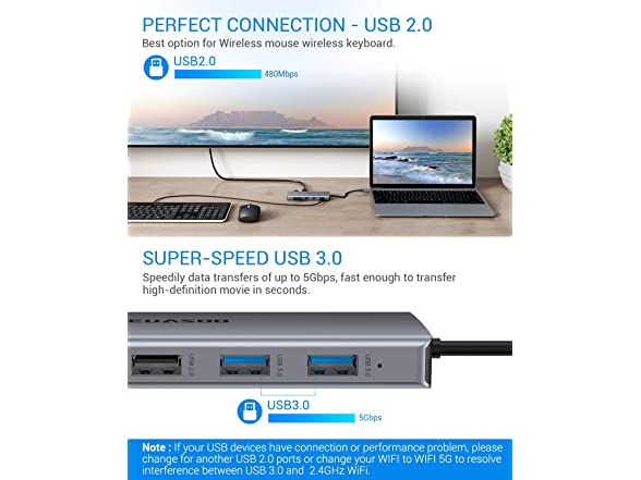 • Super speed data transmission: 1000Mbps Gigabit RJ45 Ethernet brings you a 1G movie in few minutes. Two 3. 0 USB ports support transmission speed rates of up to 5 Gaps. Two USB 2. 0 ports provide a more stable connection without wireless interference. Due to the USB 3. 0 radio frequency interference to the wireless connection, It is advisable to connect your wireless device to the USB 2. 0 port which located on the same side of the HDMI port.