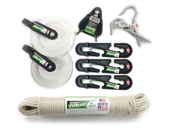 Everlast® #100 Clothesline Kit - Complete Set of Hardware Plus 100 feet of Premium #8 Clothesline. Includes 2 Pulleys, 3 Separators, 1 Line Tightener, 2 Hooks. Weatherproof. Made in USA