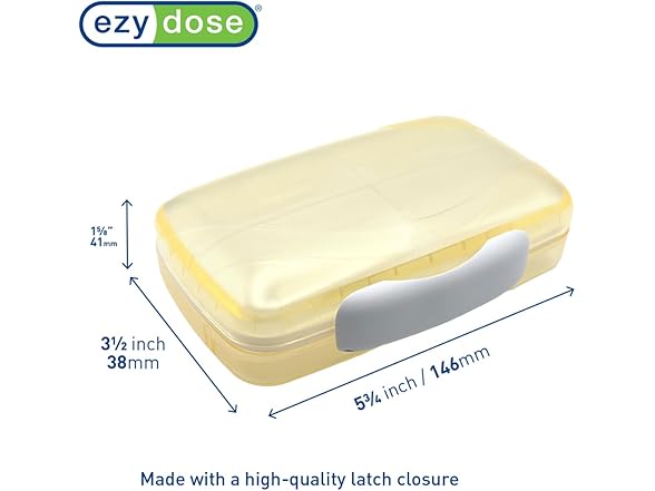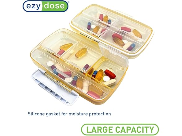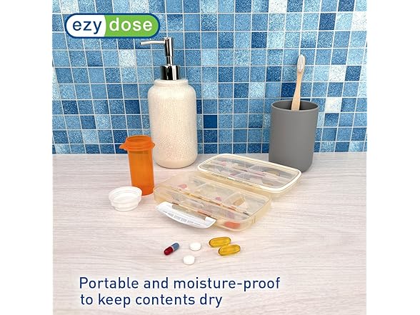 The EZY DOSE Moisture-Proof Pill Case is the ultimate solution for keeping your pills, vitamins, and supplements safe, organized, and fresh. Designed with high-quality, BPA-free materials, this pill organizer is perfect for everyday use, whether you’re at home or on the go. With a sleek cream design and a compact, portable size, it fits effortlessly into your bag, purse, or travel kit. This pill case features a silicone gasket that creates a tight, moisture-proof seal, ensuring your medications remain dry and effective, even in humid environments. The secure latch closure adds an extra layer of protection by locking the case firmly shut to prevent spills and keep your contents safe during transport. Inside, the organizer is equipped with eight individual compartments of varying sizes, providing ample space to store different types of medications, tablets, or vitamins. Each compartment is designed for easy access and helps you sort and plan your daily doses efficiently. Whether you’re traveling, commuting, or just managing your daily medication routine, the EZY DOSE pill case offers unmatched convenience and reliability. Its lightweight and durable construction ensures long-lasting performance, while the modern cream design complements your busy lifestyle. Keep your medications organized, protected, and easily accessible with the EZY DOSE Moisture-Proof Pill Case—the ideal companion for anyone seeking a practical, travel-friendly pill organizer.