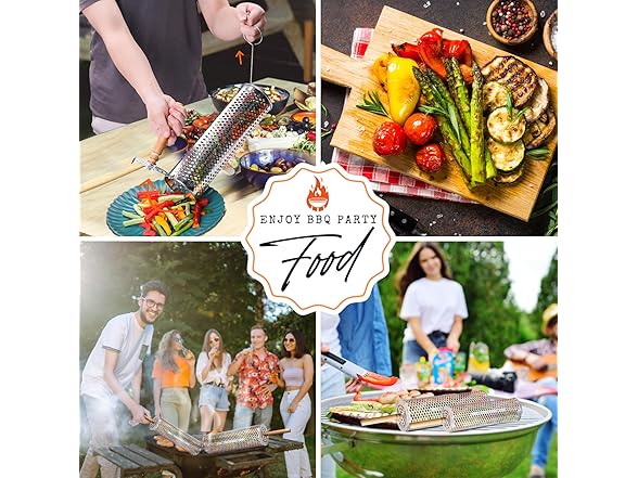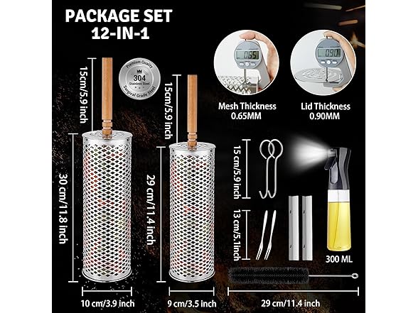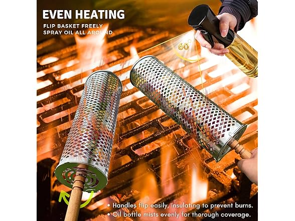 Fanaticook 2PCS Nesting Grill Basket with Wooden Handle,10oz Oil Sprayer, Cleanning Brush - 304 Stainless Steel Thickened Grill Baskets for Outdoor Grill, BBQ Large Round Tube Net Mesh for Veggies, Shrimp, Birthday & Rolling Grilling Accessories Gifts for Men