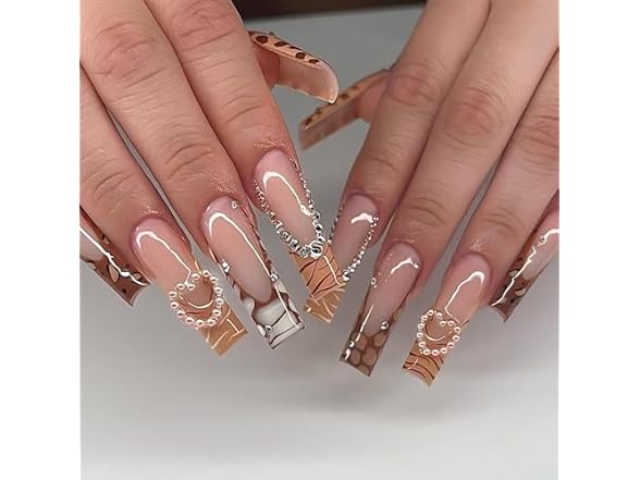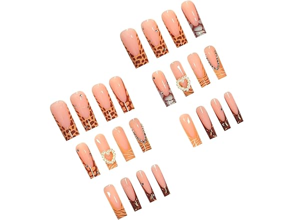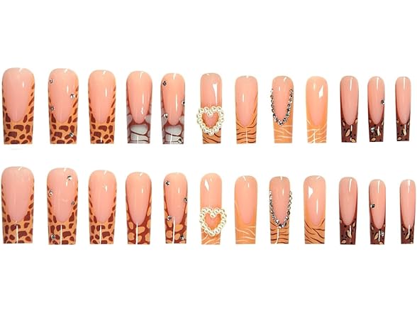 FORBELOVED NAILS,French Tip-Black Press On Nails,Long Square Glue On Nails,Heart Love,Crystlals Decorations False Nails For Women And Girls,12 Sizes-24Pcs with Glue,(Nude),FOB