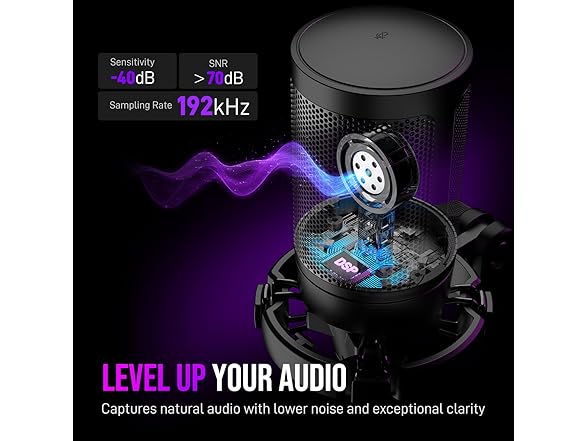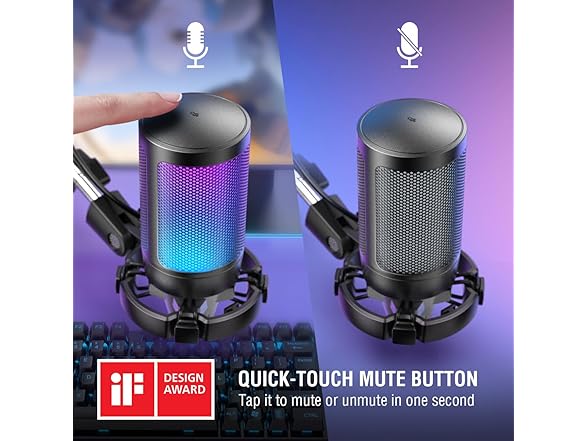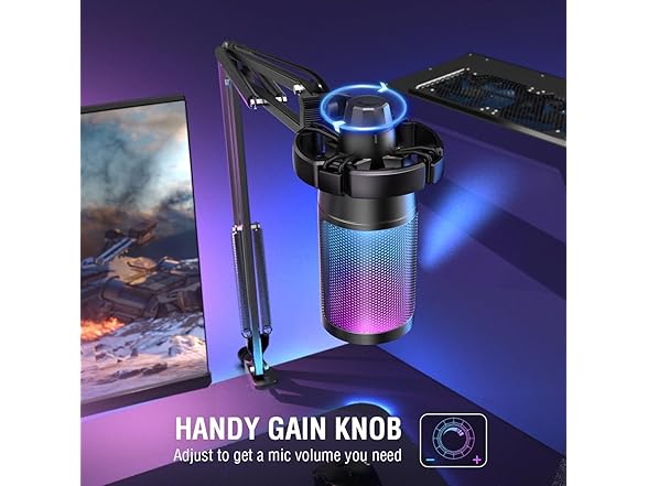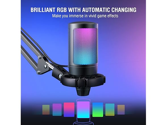 - [Cool Lighting Design] Two-tone automatic gradient RGB makes your PC windows microphone icing on the cake. With soft and coordinated light effects, your game video or live streaming will be more rainbow eye-catching via the USB mic with boom arm. Make your channel stands out from ranking list. If you are just a game player, the rich RGB on the stream microphone for PC matching with your flowing colors computer accessories can meet the needs of more game atmosphere.