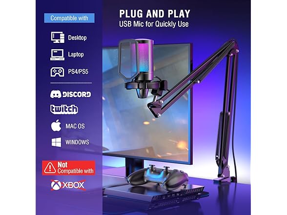 - Right Out-of-the-Box] The plug-and-play gaming microphone set doesn't need additional plug-ins or complicated device setup steps. The USB gamer microphone for PC is compatible with Windows, Mac OS and Mac/PS4/PS5. The streaming microphone end is reversible type-c interface, no trouble to plug the right way in dim game atmosphere. The 8.2ft (2.5m) USB-C to USB-A/C cable is long enough to extend from behind the host to the desktop for clear audio gaming singing recording.