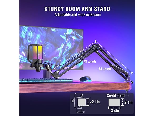 - Warm Tips-1)The gaming PC USB microphone set package include, Standing Computer Microphone with Shock Mount*1, Pop Filter*1, Boom Arm Stand with Adapter*1, 8.2ft (2.5m) USB-C to USB-A/C Cable*1, C-clamp*1, User's Manual*1. 2) The RGB microphone stand can mount tightly to the desk up to 2” thick. 3) Please first to loosen the screw on C-clamp, and then to adjust the position of boom arm.