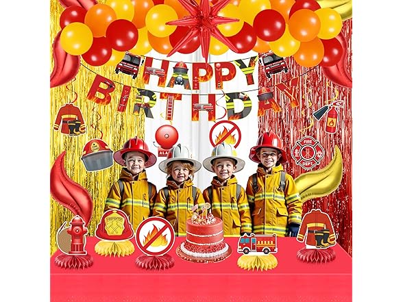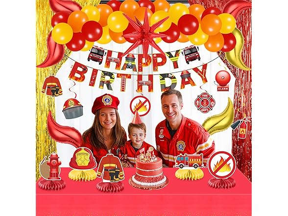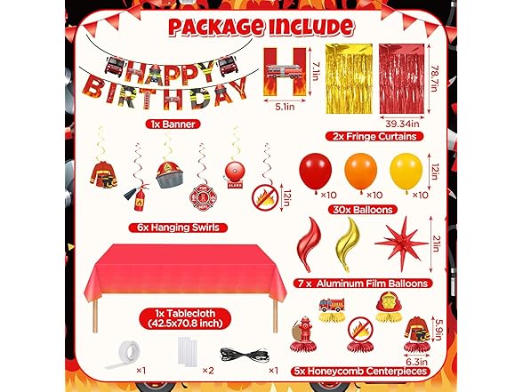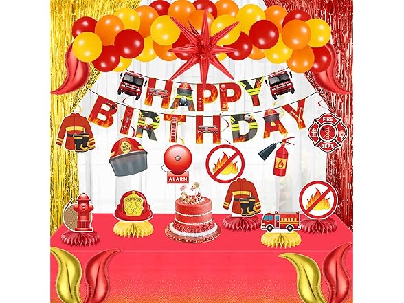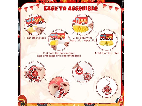 - Quality Material: The fire truck birthday hanging banner, swirls, and honeycomb centerpieces are made of quality cardstock; the firefighter theme balloons are made of latex and aluminum foil, not easy to break; the tablecloth is disposable, saving your time to clean