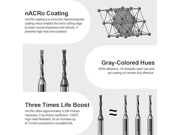 - NANOCOMPOSITE COATING: Our Coated bits feature a nanocomposite coating with 4500HV nanohardness, 1100℃ heat resistance and 0.35 COF. Bring you a super wear-resistant experience.