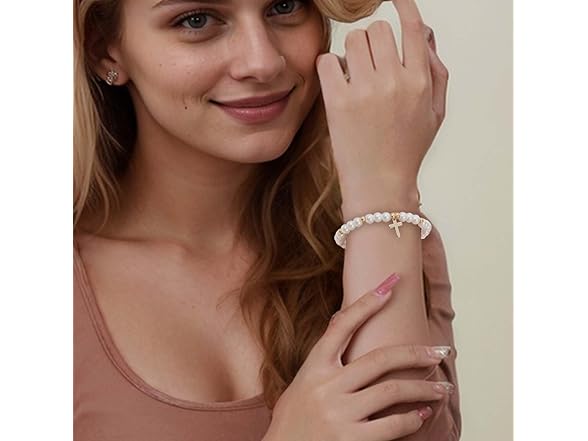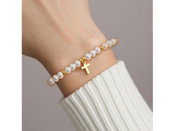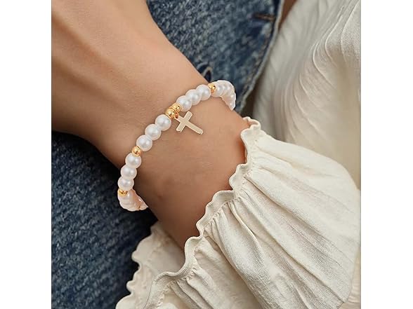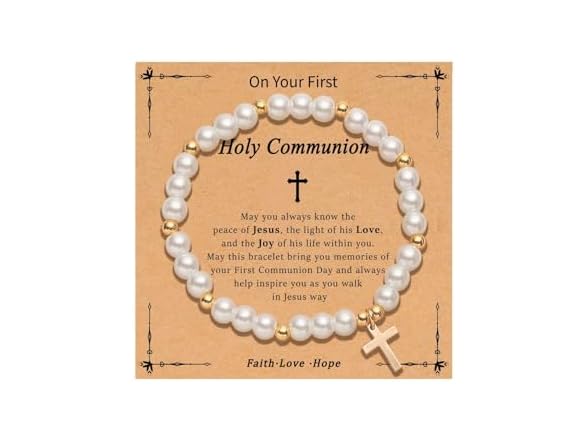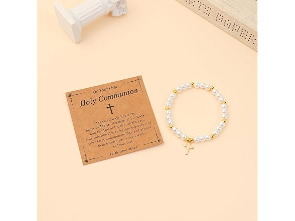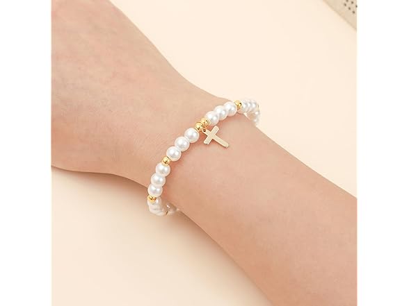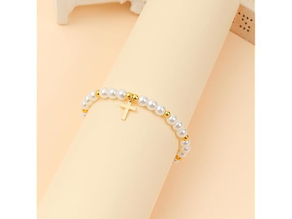 Flvkev Catholic First Communion Gifts, Cross Charm Pearl Bracelet 1st Communion Religious Jewelry Gifts for Daughter Granddaughter Sister Niece