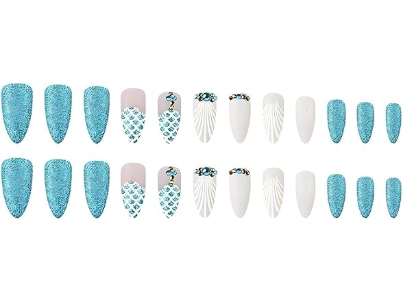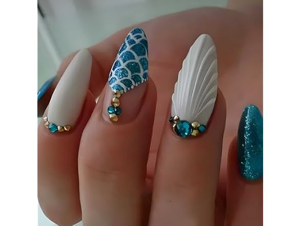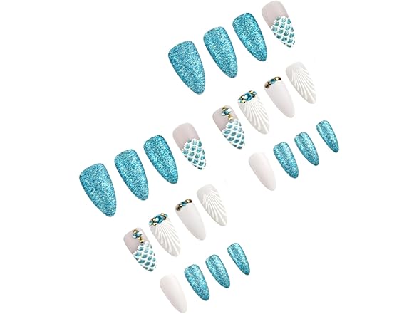 • (1) FORBELOVED NAILS,Blue Mermaid Tails Press On Nails,Medium Almond Glue On Nails,Shiny Gems,White Shells Design False Nails For Women And Girls,12 Sizes-24Pcs with Glue,(Blue-MA),FOB