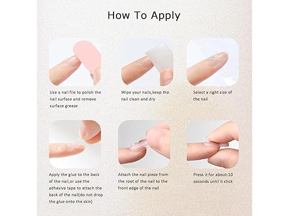 • Product Features:Suitable for ages 6 and up (Keep away from young children to prevent accident),Self-adhesive, high viscosity, invisible finish, easy to apply & remove, clean.Durable and break-resistant, with a soft base for extra comfort on the nail bed.Use jelly adhesive tabs for short-term wear (around 1 week),for longer-lasting wear (2+ weeks),nail glue or cure with a UV lamp to keep the nails firm.Doing tasks such as housework, typing, and gardening while keeping your nails durable!
