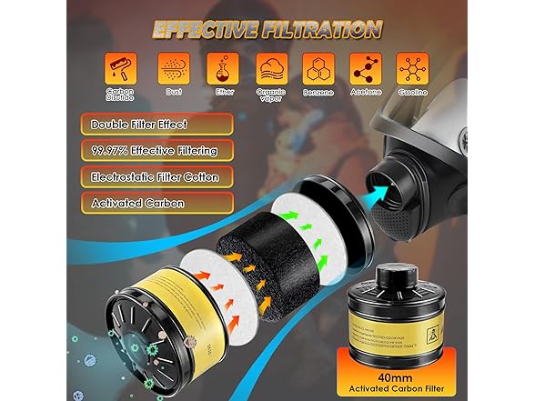 - 【Satisfaction Service】If you have any dissatisfaction and need help, please feel free to contact us, we will solve your problem and provide any help immediately. The Package Includes 1x Full Face Respirator Mask, 1x 40mm Activated Carbon Filter.