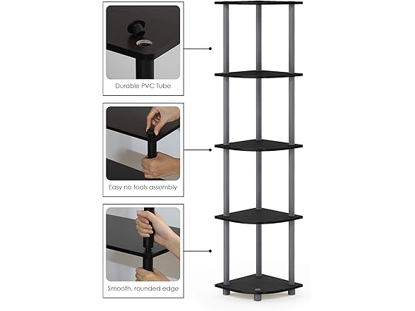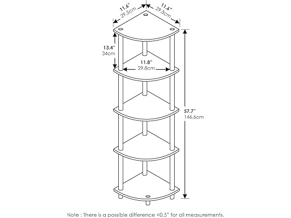 Furinno Home living mini storage and organization Series: 5-Tier no tools tube corner display rack shelving unit. (1) unique structure: open display rack, shelves provide easy storage and display for decorative and home living accessories. Suitable for rooms needing vertical storage area. Designed to meet the demand of low cost but durable and efficient furniture. It is proven to be the most popular RTA furniture due to its functionality, price, and the no hassle assembly. (2) smart Design: easy assembly and no tools required. A smart design that uses durable recycled PVC tubes and engineered particleboard that withstand heavy weight. Just repeat the twist, turn and stack mechanism, and the whole unit can be assembled within 10 minutes. (3) eco-friendly: The E2 grade particleboard is manufactured in Malaysia and comply with the rules of eco-friendly production. There is no foul smell, durable and the material is the most stable amongst the particleboard. The PVC tube is made from recycled plastic and is tested for its durability. A simple attitude towards lifestyle is reflected directly on the design of Furinno furniture, creating a trend of simply nature. All the products are produced and assembled 100-percent in Malaysia. Care instructions: wipe clean with clean damped cloth. Avoid using harsh chemicals. Please contact supportatfurinno for missing parts, damaged goods, or other questions. We are pleased to send you the replacement part free of charge. Pictures are for illustration purpose. All decor items are not included in this offer.