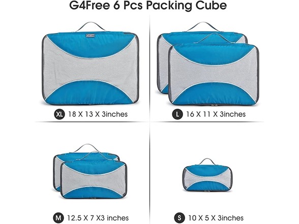 - 6 TRAVEL PACKING CUBES VALUE SET: 1 Large Cubes (20 x 12.6 x 3 inches),2 second large Cubes(15.8 x 10.2 x 3 inches),2 Medium Cubes (12.2 x 7.5 x 3 inches)and 1 small Cubes (10.6 x 5.5 x 3 inches )of same color. Durable High Quality Nylon Fabric, Quality zippers, see through mesh top.