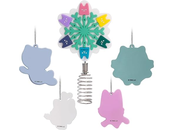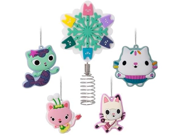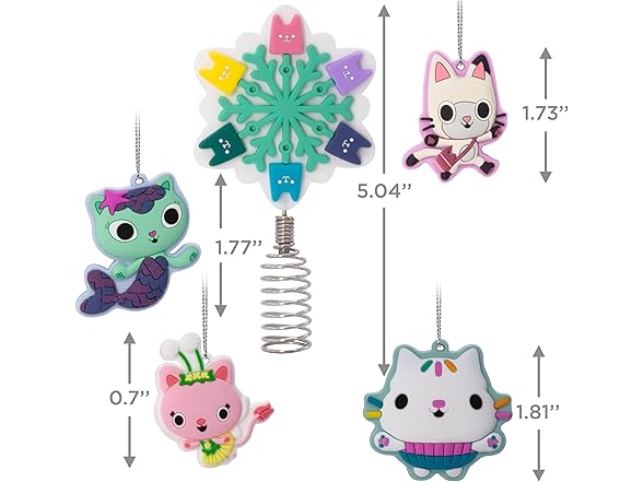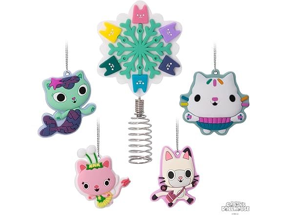 Make your tabletop tree purr-fectly magical with this "Gabby's Dollhouse" set of miniature Christmas tree ornaments and a tree topper. Four mini, shatterproof ornaments featuring Gabby's friends Pandy Paws, MerCat, Cakey and Kitty Fairy are the perfect complement to the mini tree topper with a metal spring coil base that features a dimensional snowflake shape with colorful cat designs. Hallmark Ornaments are a great way to commemorate hobbies, life events and individual interests in entertainment, sports and more. Each festive and collectible ornament is perfect for sharing with family and friends.