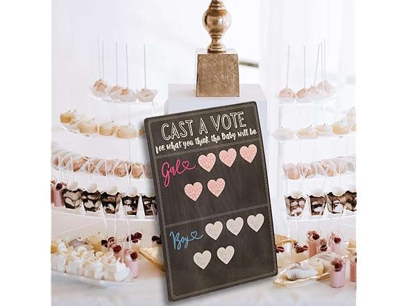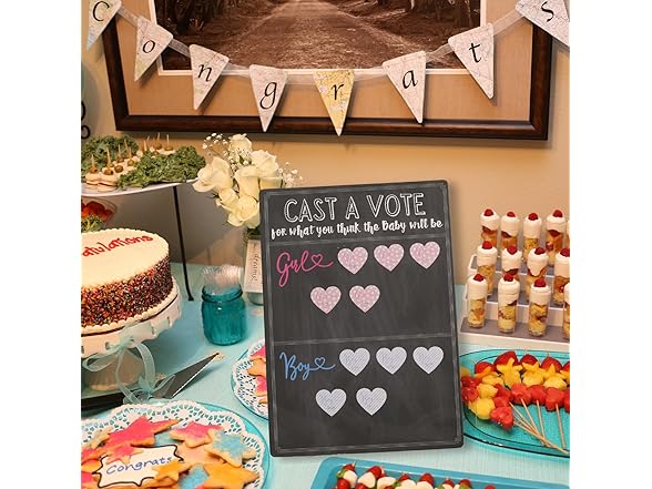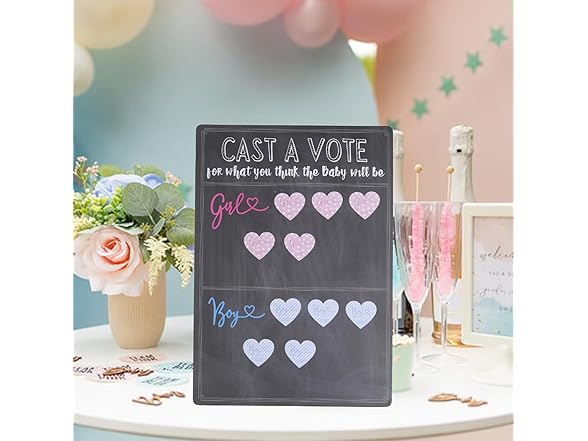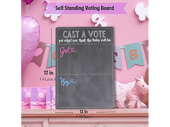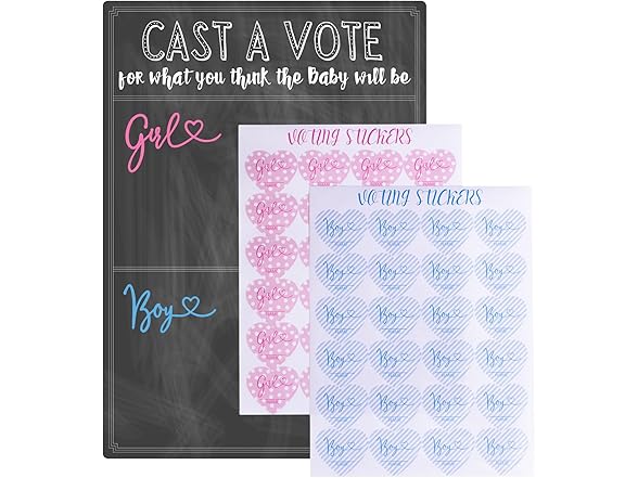 - Dimensions & Quality: The cast your vote gender reveal board measures 12 x 17 inches (30.5cm x 43.2cm) and the pre-cut boy or girl heart shape vote stickers measure 1.5 x 1.4 inches;The voting board is made of thick cardboard makes it stable to place on and durable to use.The surface adopts sublimation printing,so both the voting board and sticker's colors are vibrant and pattern looks professional.