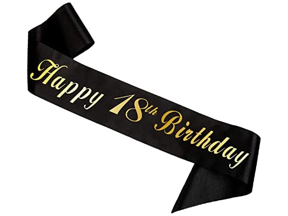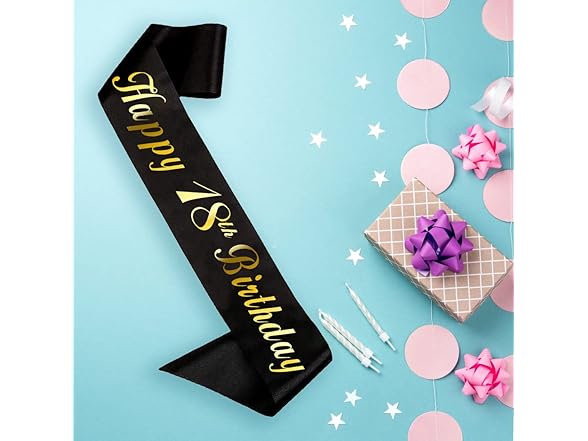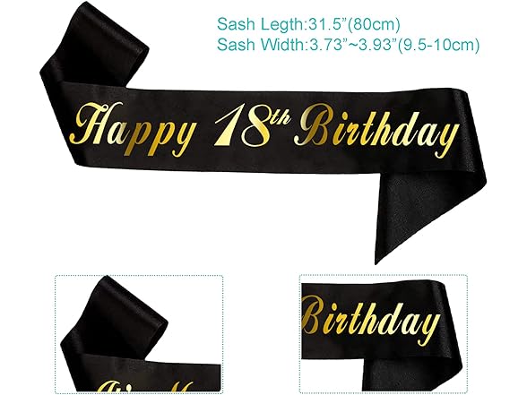 HAPRTY Happy 18th Birthday Sash, Black Birthday Sash with Foil Lettering for 18th Birthday Party Decorations Supplies Gifts Favors Features: Material: the birthday sash made of smooth fabric satin sash. Color: black birthday sash with gold foil letters Sash Size: About 63 inches(160cm) length and 3.94 inches(10cm) wide, fit for most people. Perfect for 18th Birthday Party Supplies Favors and Decorations! Enjoy a memorable birthday party with this black birthday sash, looks great on Instagram. upgrade your birthday party celebration. If you're looking for birthday sash to decorate your birthday celebration, look no more. Our sashes complement any birthday outfit while making sure your beloved birthday boy feels so special on he birthday! it could be smart photography props, enjoy taking photos with your familes and friends and creating a happy atmosphere for your birthday Party. Warm Tips: Please note that if the sash arrives slightly wrinkled from transit - Just use cool iron and Iron on reverse side only, it's best to iron on the back of the sash to prevent the foil from melting! After-sales Service: The happy 18th birthday sash packaged all carefully, We will be responsible for them. Please feel free to contact us If you have any problems with our items or services, We will do our best to solve any problems for you. We guarantee 90 days money back or free exchange if there is a quality problem. thank you for your support!