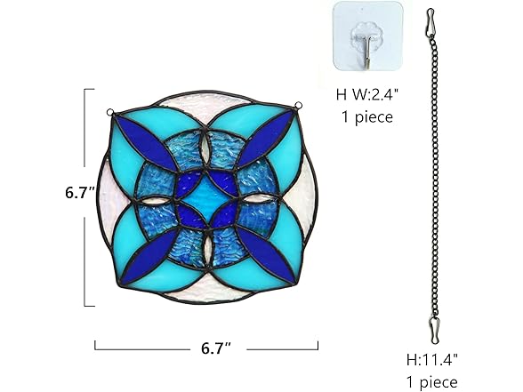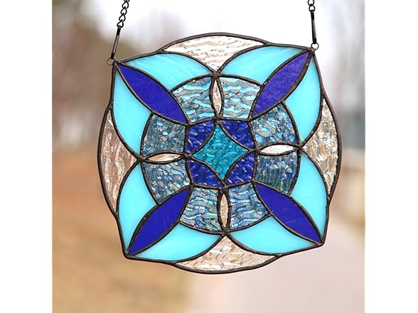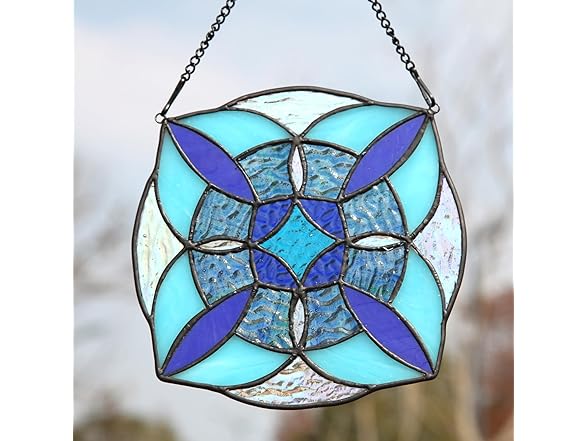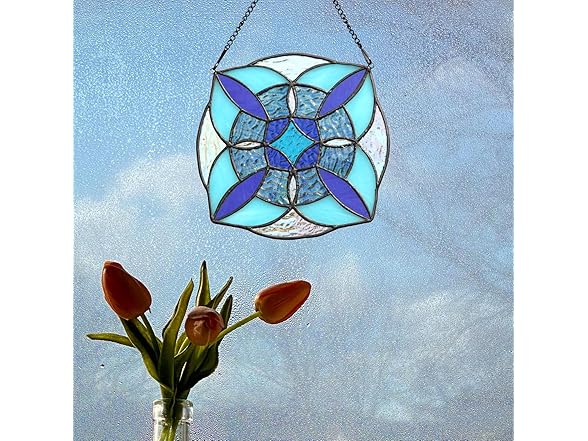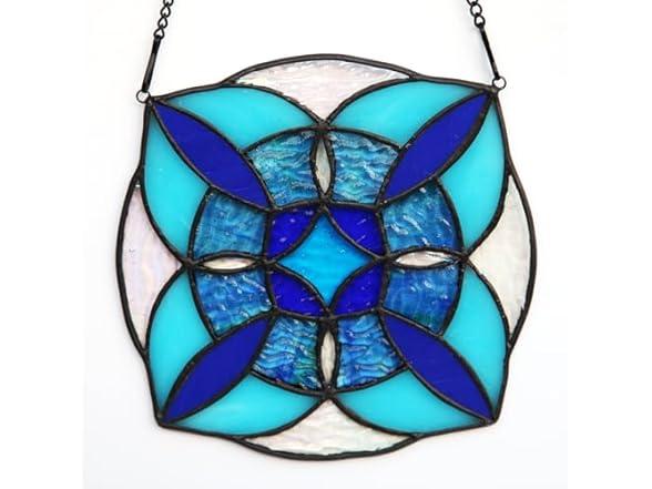 Round Geometric Blue Stained Glass Window Hanging Panel Light Catcher Handmade Window Treatments