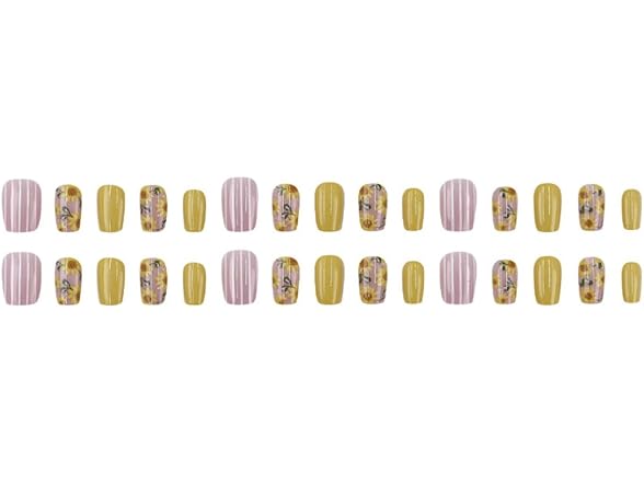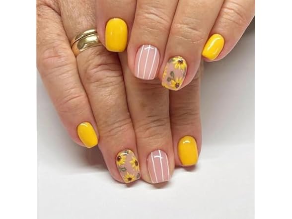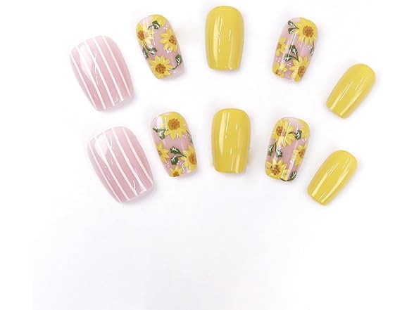 Geyakal Flower Press on Nails Short Square Acrylic False Nails Yellow 24 Pcs with Designs Striped Sunflower Glossy Full Cover Jelly Glue on Nails Artificial Stick on Nails for Women Decoration