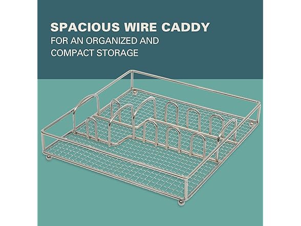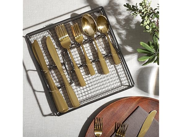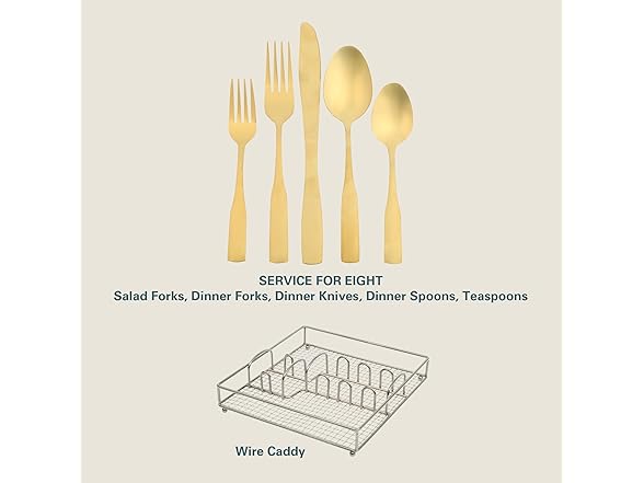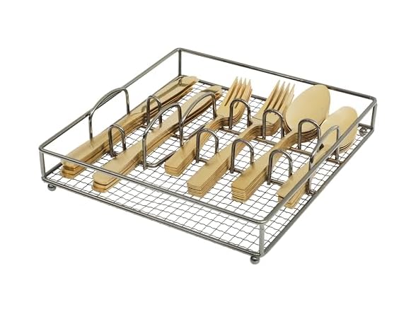 FLATWARE CADDY: Spacious wire caddy organizes the flatware set in neat compartments for compact storage.