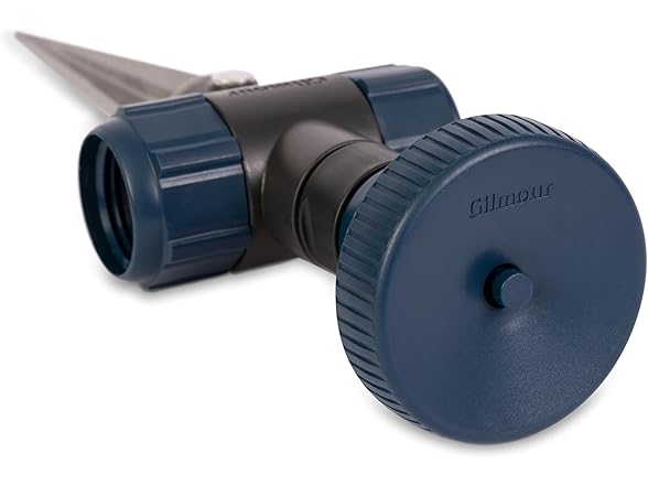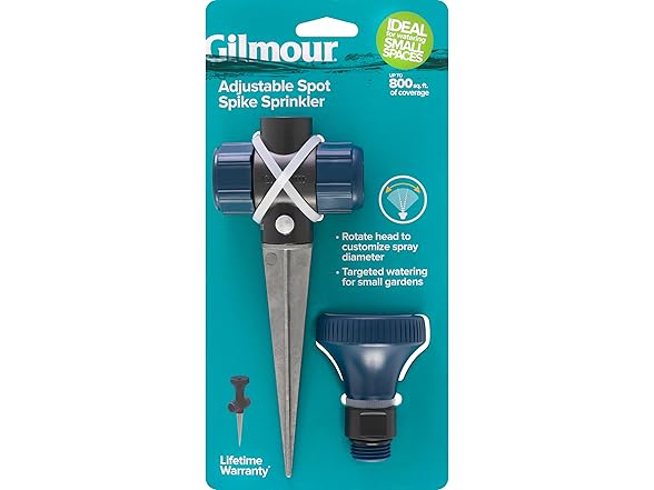 The Gilmour Adjustable Spot Sprinkler with Spike Base is ideal for targeted watering of planters, pots, new trees, garden beds and trouble spots on the yard. Turning the head adjusts its cone-shaped spray pattern and circular coverage area, ensuring that you water exactly where you want. An outlet valve on the base allows you to connect multiple sprinklers to suit your needs, and its durable metal spike provides stability in softer soil and on uneven ground.