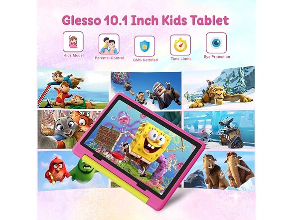 Gleeso Kids Tablet - Android 15 Tablet with HD Display,10.1 inch,Parental Control & Kids Mode, Octa-Core, GMS Certified, 3GB RAM 64GB ROM,1TB Expandable, 5000mAh Battery, Dual Camera, Protective Case,Pink