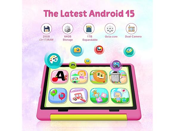 - Android 15 Systerm&Octa-core Processor:Powered by a 2.0GHz Octa-core processor (40% faster than basic tablets) and the latest Android 15 OS, this kids tablet delivers smoother Zoom classes and lag-free gaming. And the 3GB RAM with 17GB virtual RAMhandles multiple educational apps simultaneously, while enhanced security blocks unwanted ads.